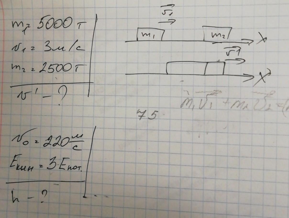 1. При столкновении m1= 5000т m2=2500т v1(до столкновения=3м/с найти:v2 после столкновения