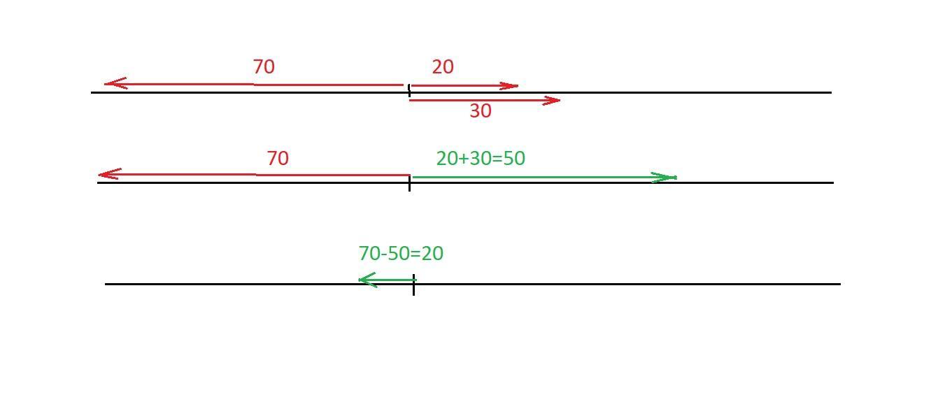 2) находим равнодействующую 50-70= -20 Н (в торону 70 Н. Минус означает влево по оси ОХ)