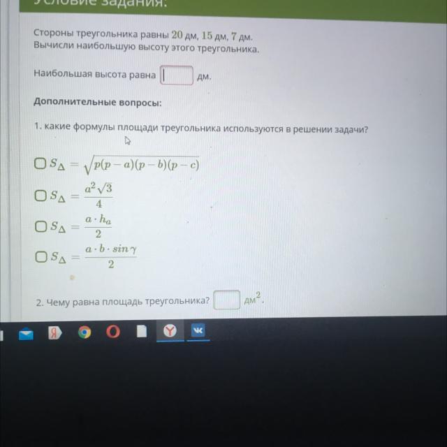 полупериметр=(20+15+7)/2=21 дм площадь=v(21*1*6*14)=v1764=42 дм. кв. высота=42*2/7=84/7=12 дм