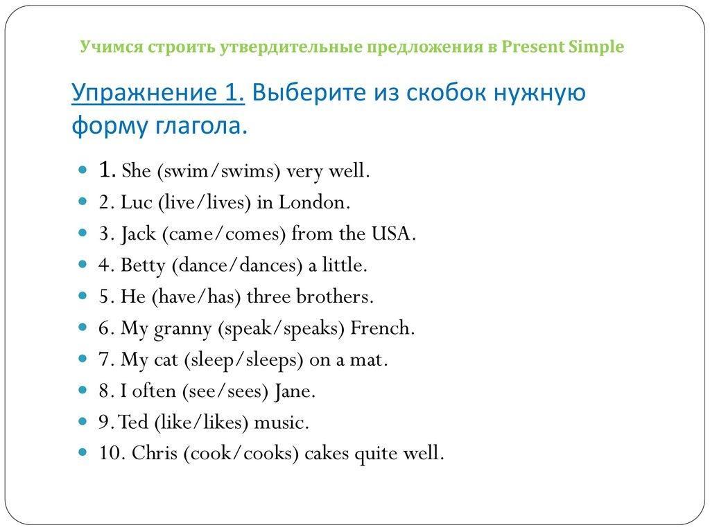 Ответ: 1 swims 2 lives 3cames 4dances 5 has 6 speak 7 sleep 8 see 9 likes 10 cooks