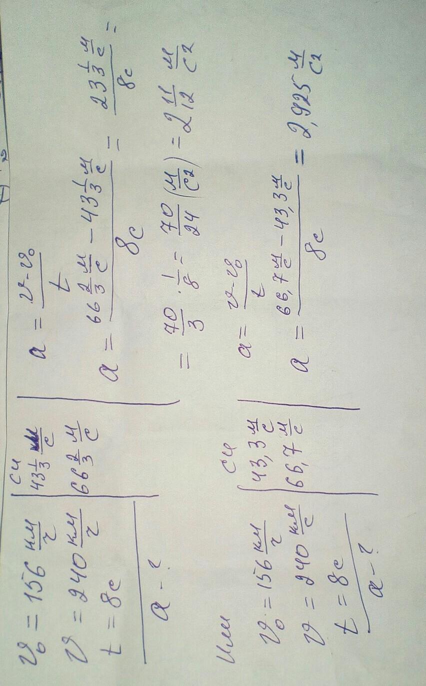 C каким ускорением движется гоночный автомобиль, если его скорость за 8 с увеличивается со 156 до 240 км/ч?
