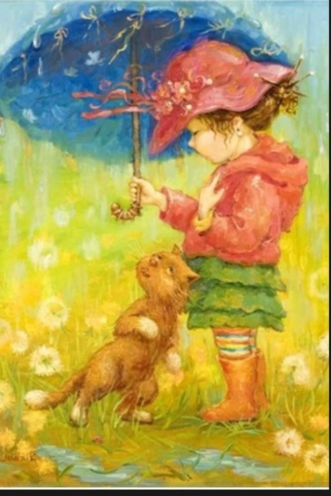 Мы видим что на картине девочка лет пяти шести играется с котом на улице под зонтом ,пока идёт дождь. Рыжий котик ласкает я у ножек девочки. Котик замёрз. Также мы видим что девочка одета в яркие резиновые сапоги,разноцветные гамаши,зелёную юбку и в розовенькую кофточку. На дворе не пасмурно,солнце светит,идёт дождь можно понять что после дождя будет радуга.Автор картины хотел картиной показать искреннею любовь людей к животным. Такие добрые искренние люди как девочка на картинке заботятся,любят и даже в дождь гуляют со своими питомцами.