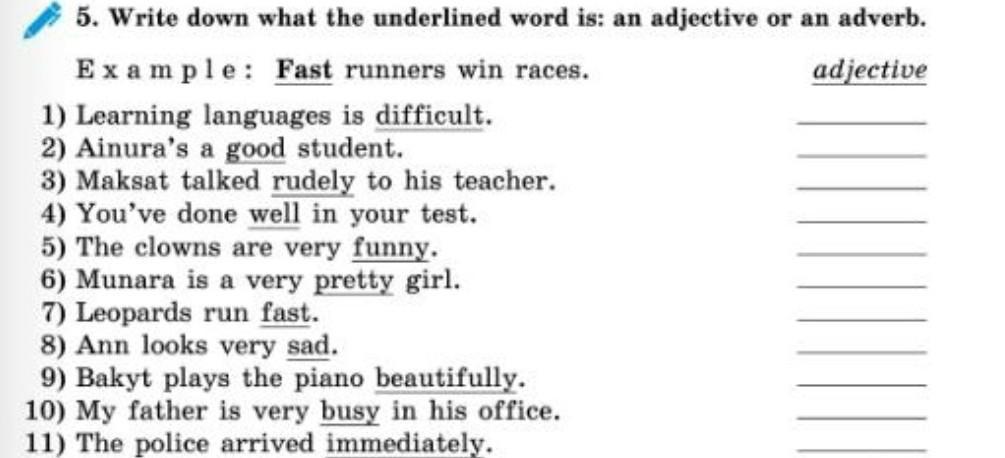 Ответ: в этом задании нужно написать, чем является подчеркнутое слово - прилагательным (adjective) или наречием (adverb). Я напишу предложения с переводом, а в скобках adj от слова adjective или adv от слова adverb.