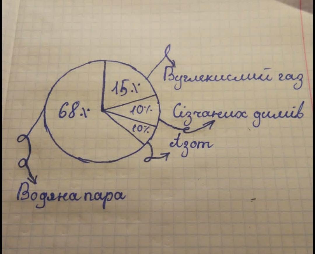 Під час виверження вулканів спостерігається виділення газів, які складаються з 65 % водяної пари, 15 % вуглекислого газу, 10 % азоту та 10 % сірчаних димів. За даними побудуйте стовпчасту діаграму.