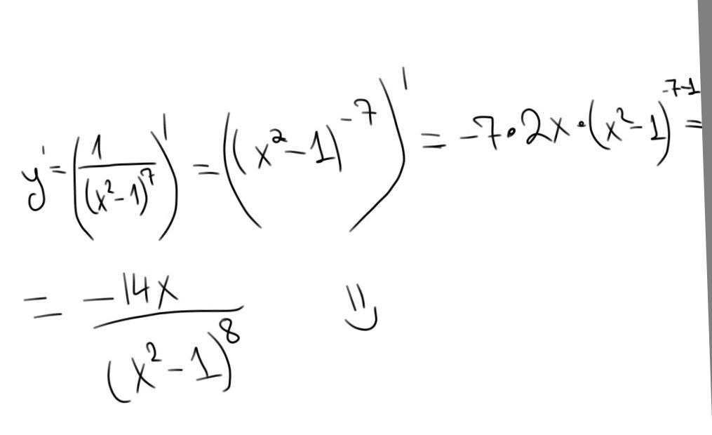 для начала поднимем скобки вверх, тогда она станет в -7 степени. выносим степень вперед. затем берем производную от внутренности скобки, это будет 2х. не забываем вычесть 1 из 7 у степени скобки. получается -8. отправляем скобки в знаменатель, и получаем скобку в степени 8. понятно?