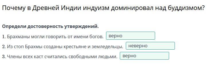 предели достоверность утверждений. 1. Брахманы могли говорить от имени богов. 2. Из стоп Брахмы созданы крестьяне и земледельцы. 3. Члены всех каст считались свободными людьми.