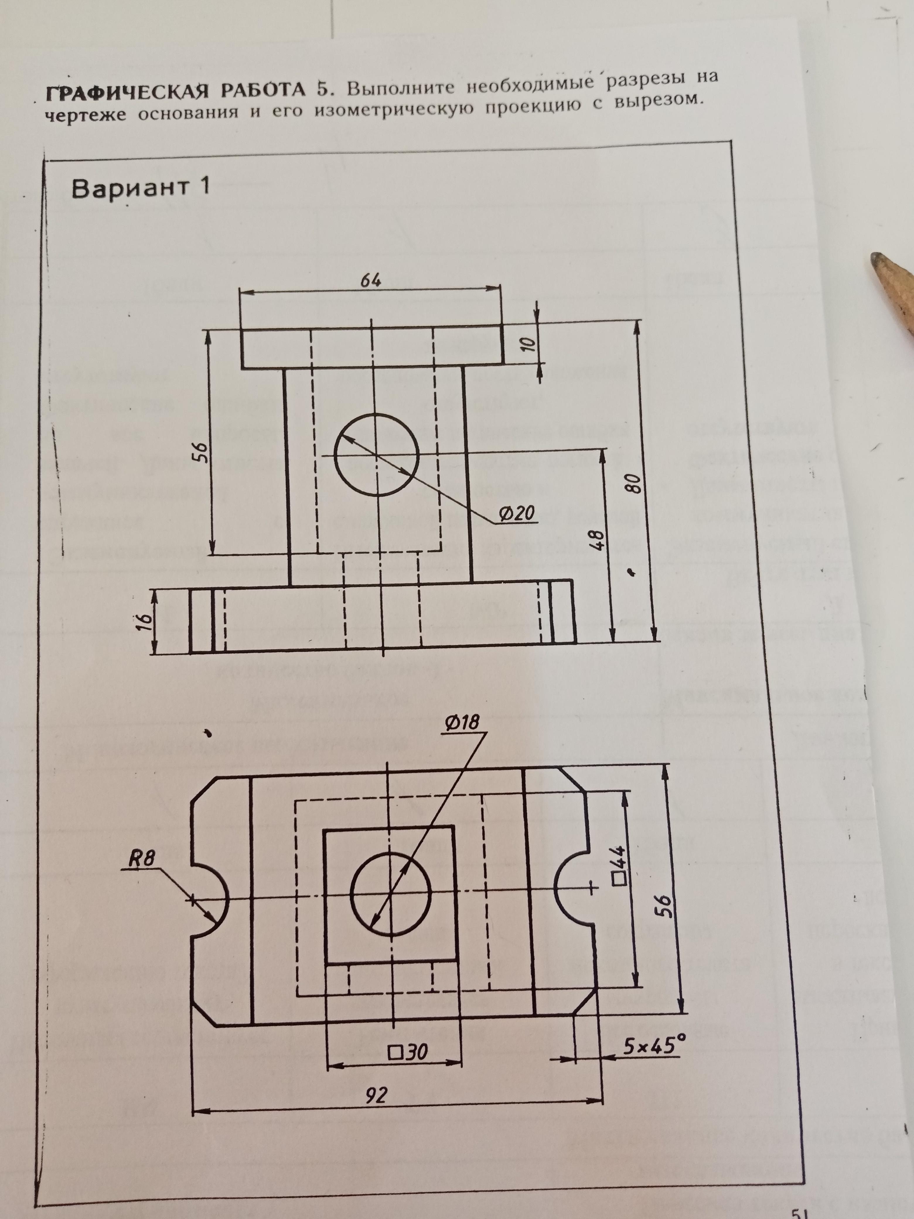 Выполнила профильный разрез, на котором хорошо видно, что отверстие диаметром 20 мм расположено на одной стенке и также показана глубина отверстия квадратной формы.