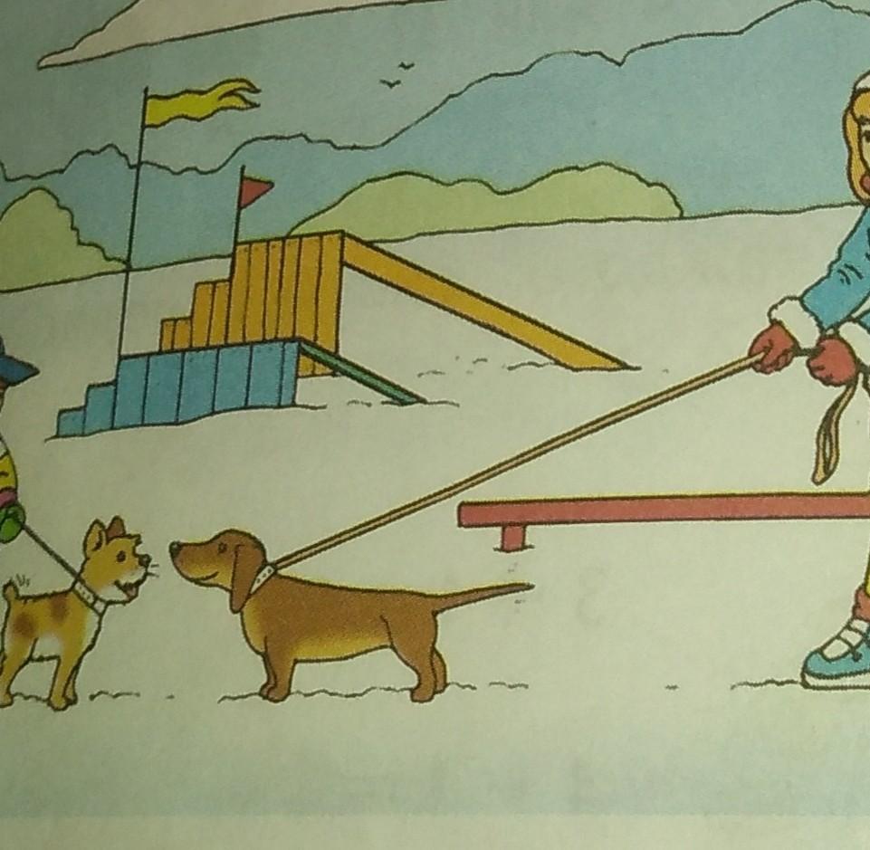 Ответ:У той собаки, что справа поводок, хвост и уши длиннее, длиннее лавочка, та что справа.