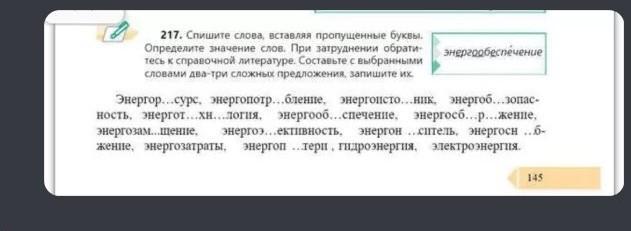 Ответ: энергоресурс, энергопотребление, энергоисточник, энергобезопасность, энерготехнология, энергообеспечение, энергосбережение, энергозамещение, энергоэффективность, энергоноситель, энергоснабжение, , энергопотери, остальное без пропусков( последние 2 и 4 с конца). Сложные предложения: В школе 1.Васёк всегда хотел узнать, что такое энергозамещение, но учитель посвятил два урока на тему энергоисточников. 2.Ваську пришлось самому искать нужную ему информацию, но его мама позвала кушать и он отложил дела на потом.