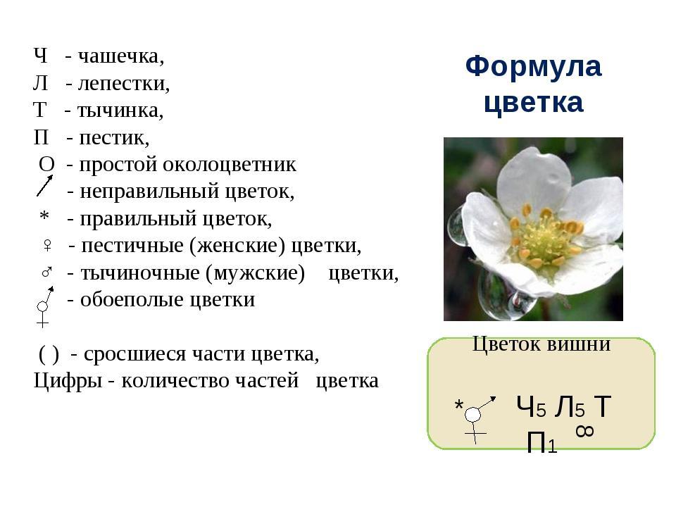 Формула цветка — условное обозначение строения цветка с помощью букв латинского алфавита, символов и цифр.