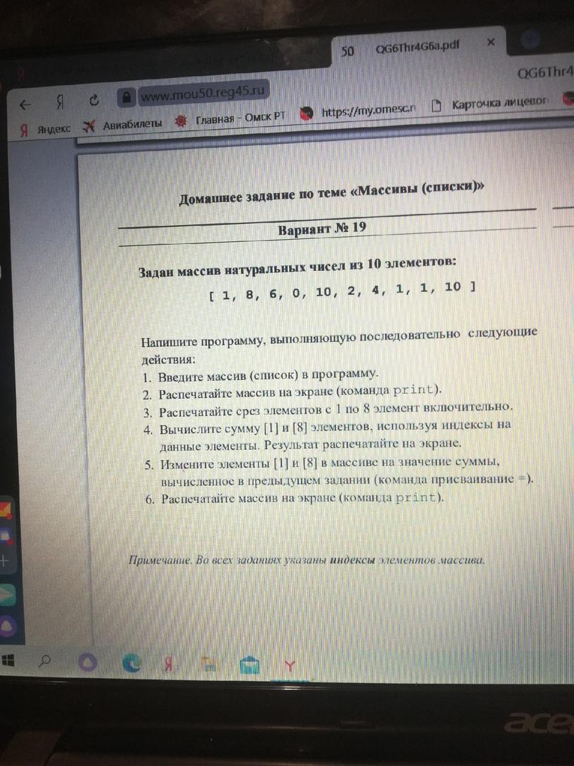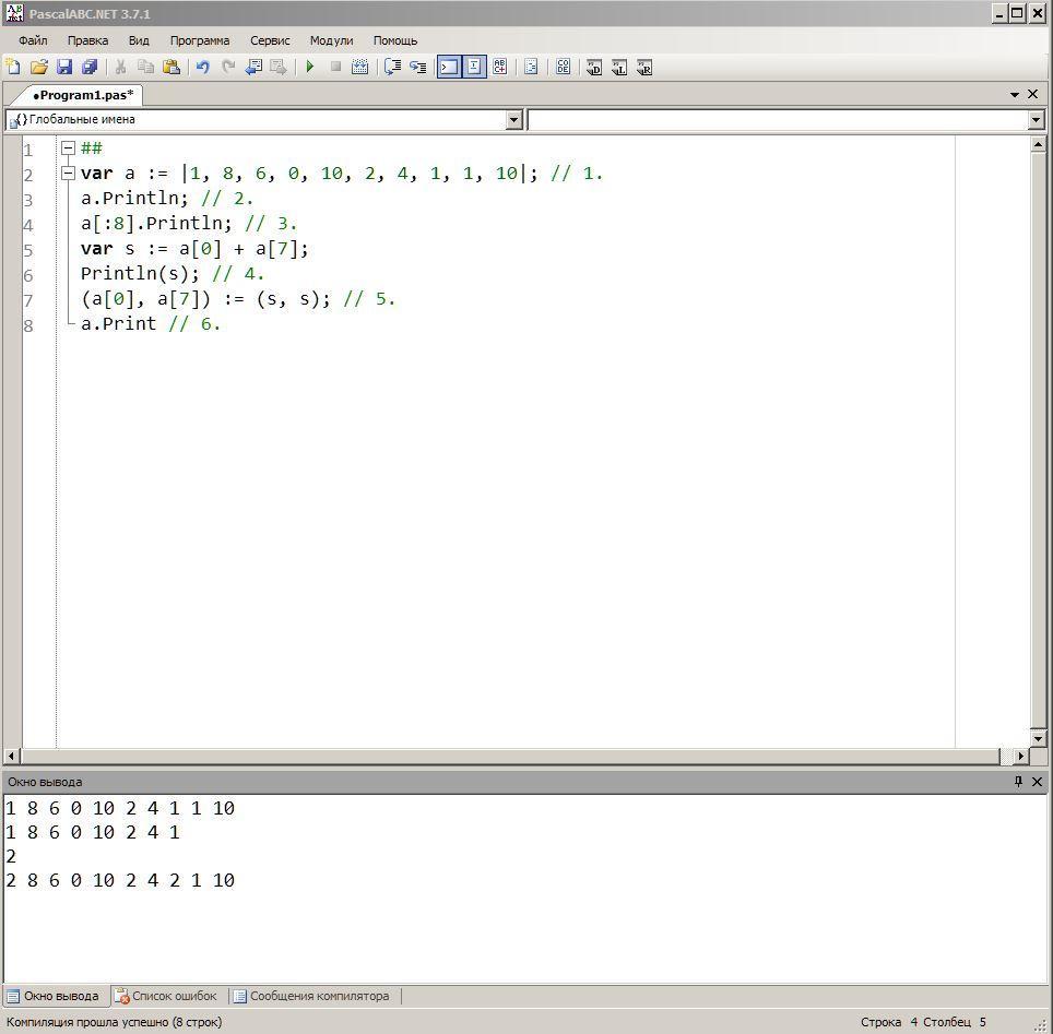 4. Вычислить сумму [1] и [8] элементов, используя индексы на данные элементы. Результат распечатайте на экран.