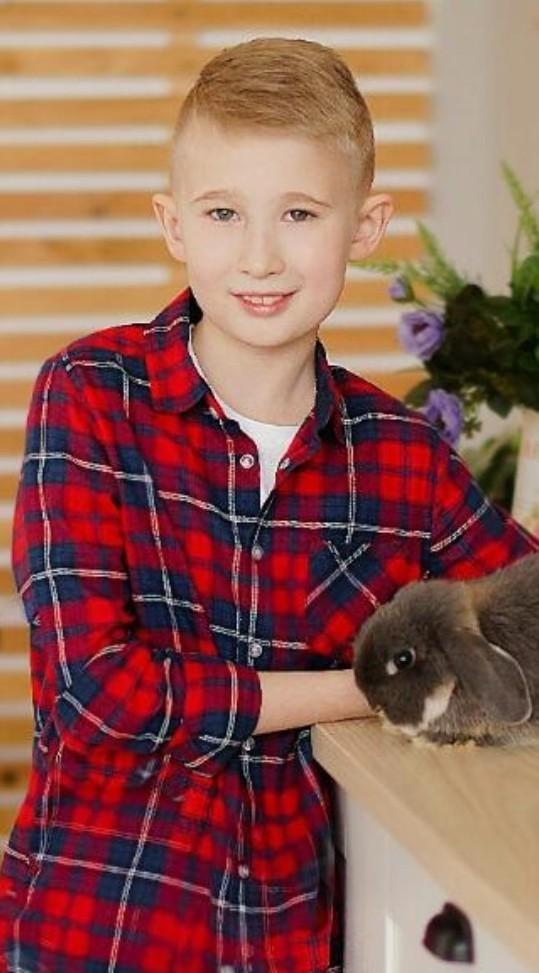 мальчик в красной клетчатой рубашке и в белой футболке с серыми глазами( там не понято карие они или серые),светлыми волосами с торчащими ушами и с светлой кожей