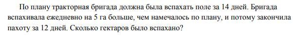 Обозначим площадь поля S, тогда S=x*14, где x - производительность бригады за 1 день (га/день). Для второго случая S=(x+5)*12=12*x+60. Приравниваем 12*х+60=14*х⇒2*х=60⇒х=30 га/день. Площадь поля (сколько гектаров было вспахано) S=30*14=35*12=420 га.