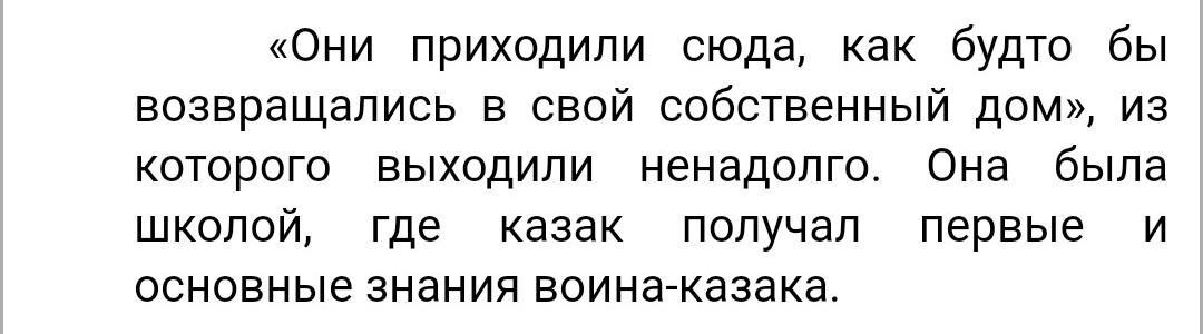 Они приходили сюда, как будто бы возвращались в свой собственный дом», из которого выходили ненадолго. Она была школой, где казак получал первые и основные знания воина-казака.