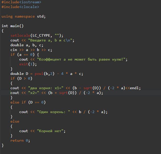 cout << "два корня: x1=" << (b - sqrt(D)) / (-2 * a)< cout << "x2=" << (b + sqrt(D)) / (-2 * a);