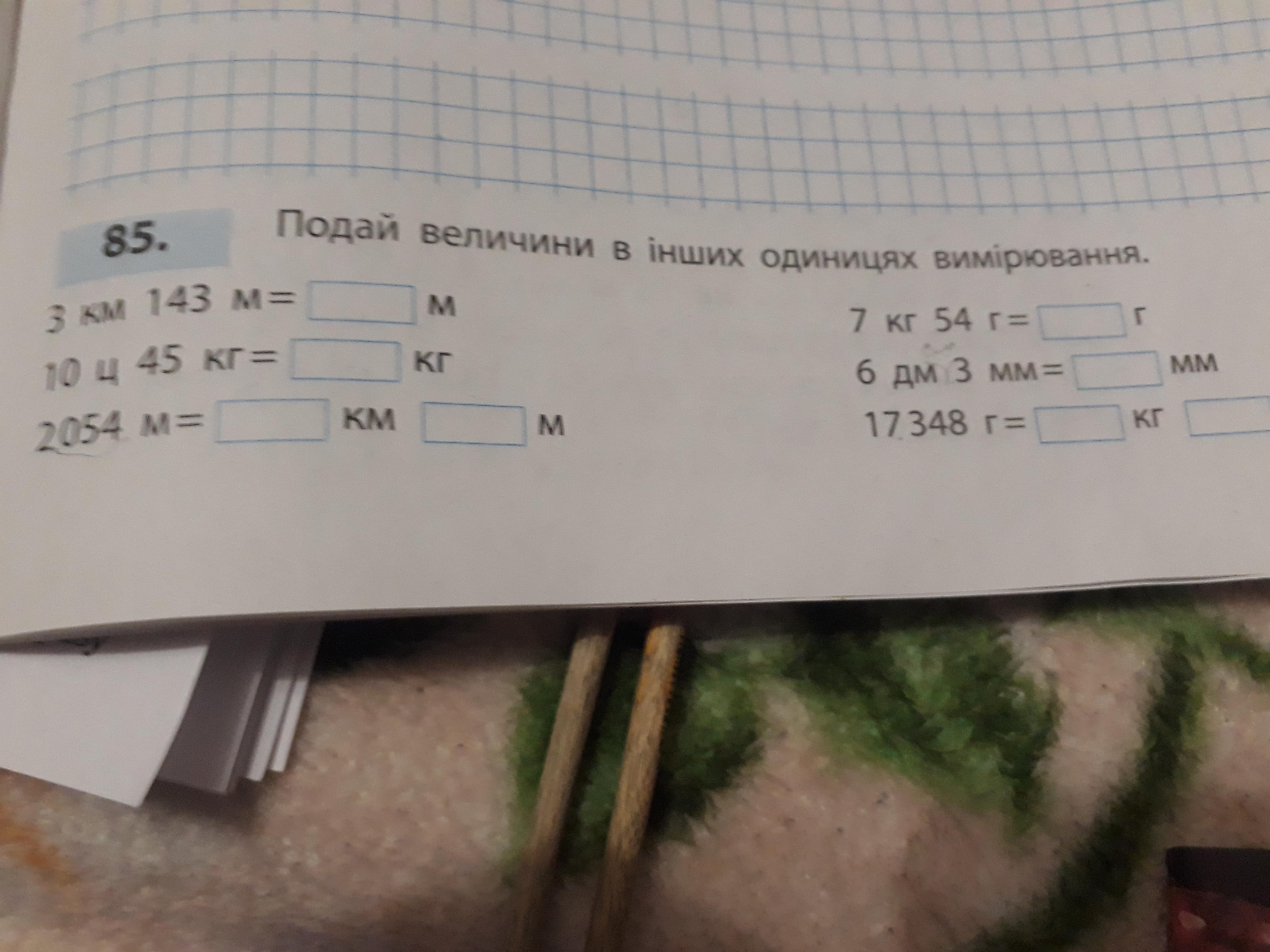 1) 3143m 2) 1045kg 3) 2km 54m 4) 7054g 5) 603mm 6) 17kg 348g