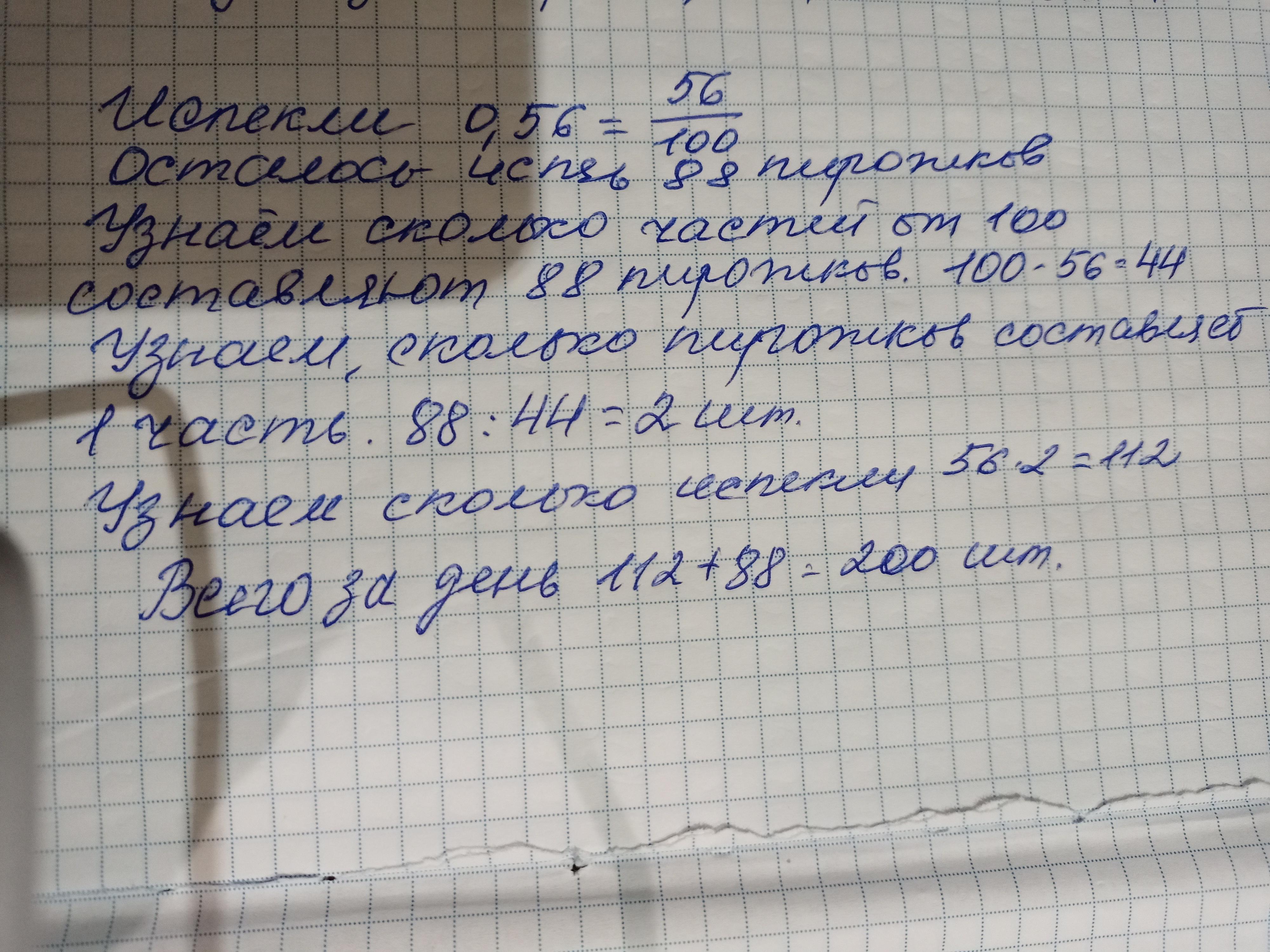 До обеда в пекарне испекли 0,56 необходимого количества пирожков и осталось испечь после обеда еще 88 пирожков. Сколько всего пирожков необходимо испечь за 1 день?