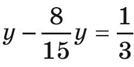 y - \dfrac{8}{15} y = \dfrac{1}{3}\\\\\\\dfrac{15y}{15} - \dfrac{8y}{15} = \dfrac{1}{3}\\\\\\\dfrac{15y - 8y}{15} = \dfrac{1}{3}\\\\\\\dfrac{7y}{15} = \dfrac{1}{3}\ \ \ \ \ \Big| \cdot 15\\\\\\7y = \dfrac{15}{3}\\\\7y = 5\ \ \ \ \ \Big| :7\\\\\\\boxed{y = \dfrac{5}{7}}