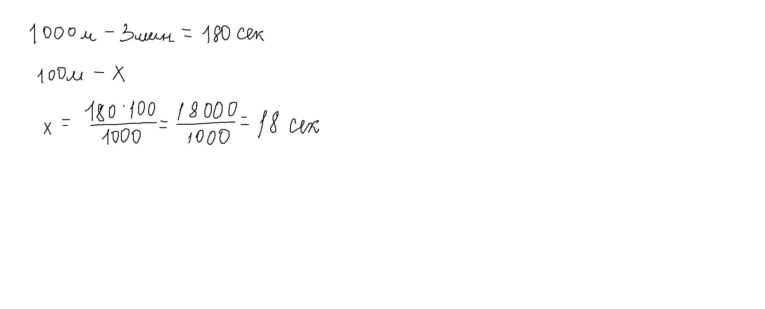если челоаек пробтжал 1 киломитер за 3 минуту ,то за сколько человек пробижиь 100 метром с такой же скоростью