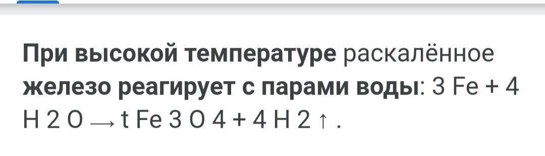 При высокой температуре раскалённое железо реагирует с парами воды: 3 Fe + 4 Н20—t Fe З04+4Н21.