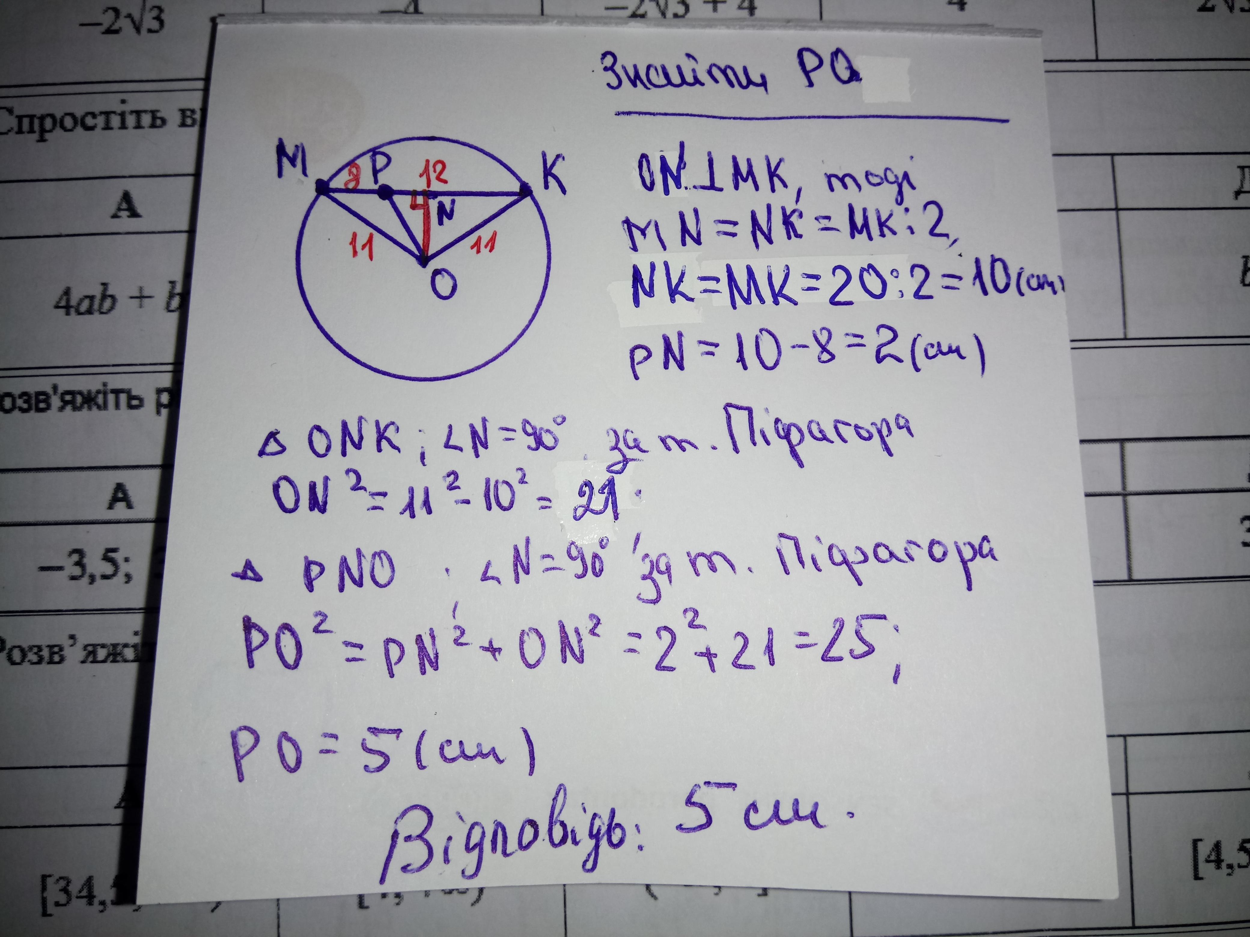 8см і 12см. Радіус кола 11см. Знайдіть відстань ло центра кола від точки Р.