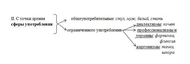 С точки зрения сферы употребления лексика делится на общеупотребительную и лексику ограниченного употребления.