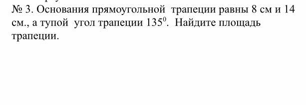 8 класс. Основания прямоугольной трапеции равны 8 и 14 см , а тупой угол трапеции 135 градусов . Найдите площадь трапеции. ПРОШУ С РИСУНКОМ ТРАПЕЦИИ