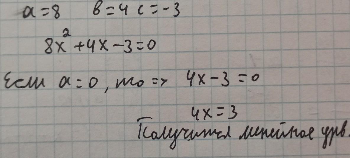 Пусть коэфициенты a=8,в=4,c=-3, составьте квадратное уравнение. Если коффициент a = 0, какой вид примет уравнение