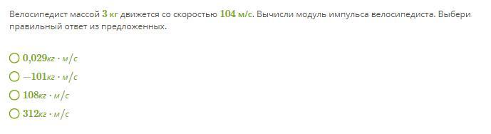 Велосипедист массой 3 кг движется со скоростью 104 м/с. Вычисли модуль импульса велосипедиста. Выбери правильный ответ из предложенных.
