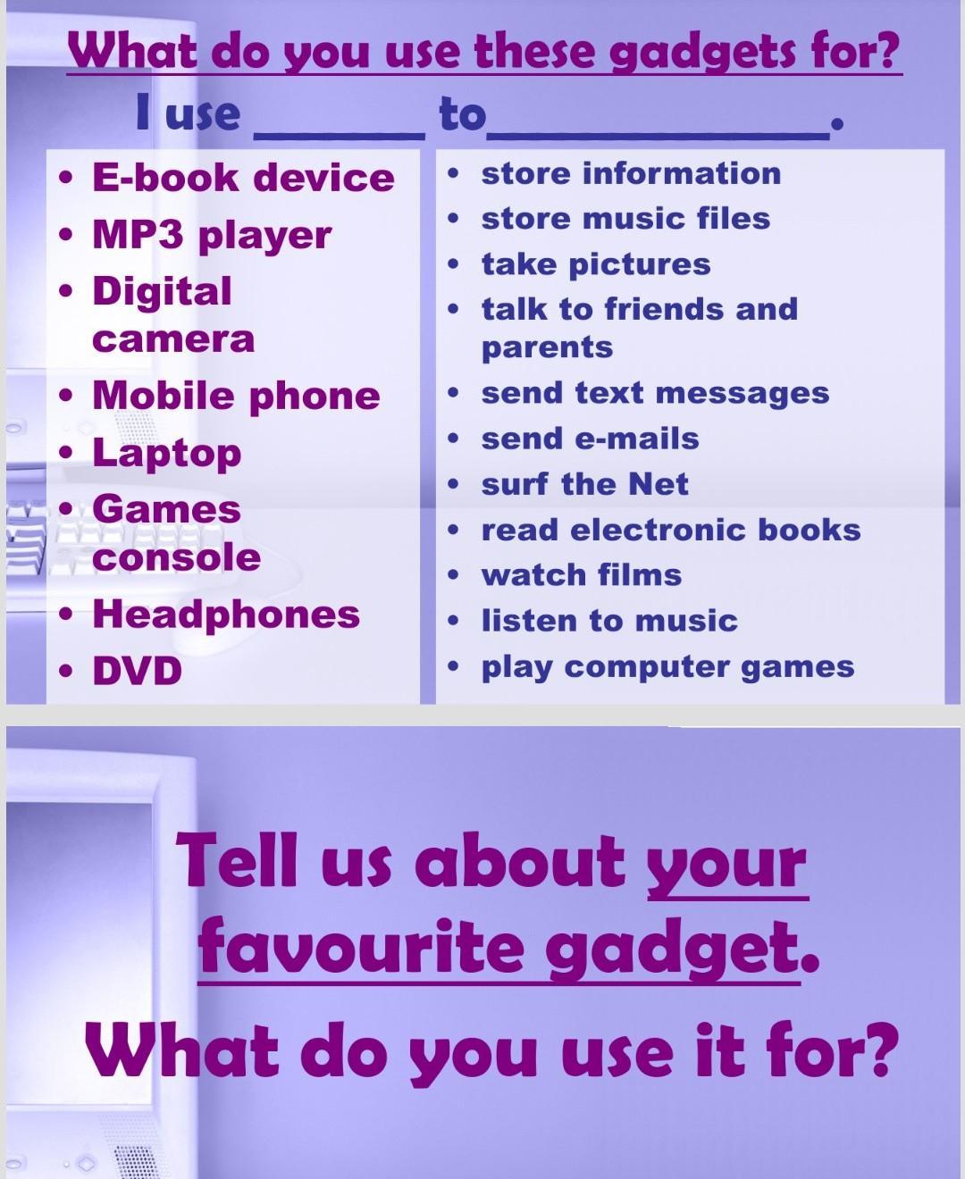 My favourite gadget is mobile phone beacuse you can use it in a lot of different ways from talking to friends and parents to play computer games. Aslo it can take great pictures as same quality as good digital camera. Mobile phone can be used in a lot of different ways, that's why it's my favourite.