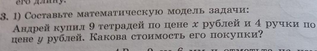 Андрей купил 9 терадей по цене х рублей и 4 ручки по цене у рублей.Какова стоимость его покупки?