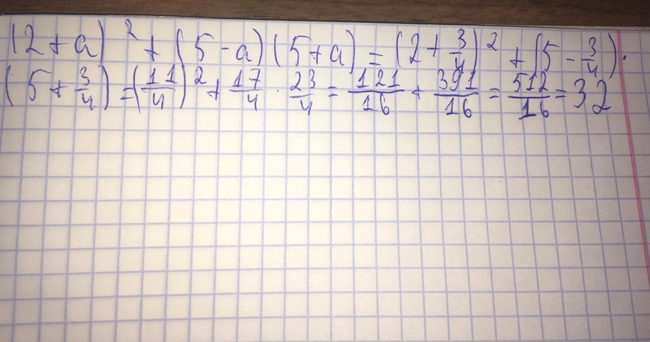 (2+а)+(5-a)*(5+a) = 4+a^2+4a +25-a^2 = 29+4a. Подставим a = -3/4 => 29-3=26