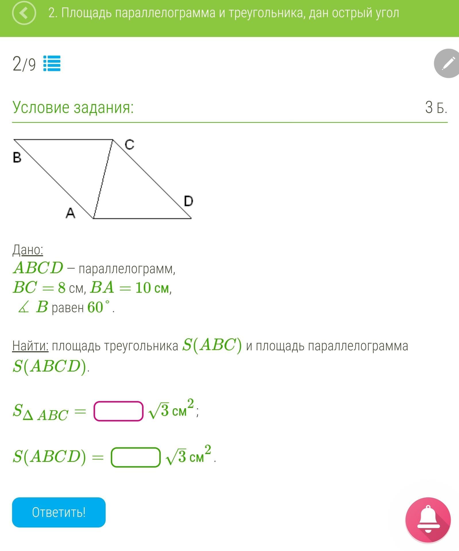 S=BC*h/2=8см*√(75)см/2=4*√(75)=20√(3)см²