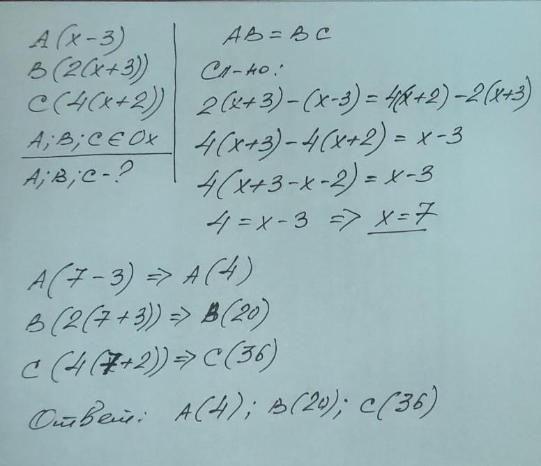 На координатной прямой даны точки А(х – 3), В(2(х + 3)) и C(4(х + 2)) по возрастанию. Если известно,