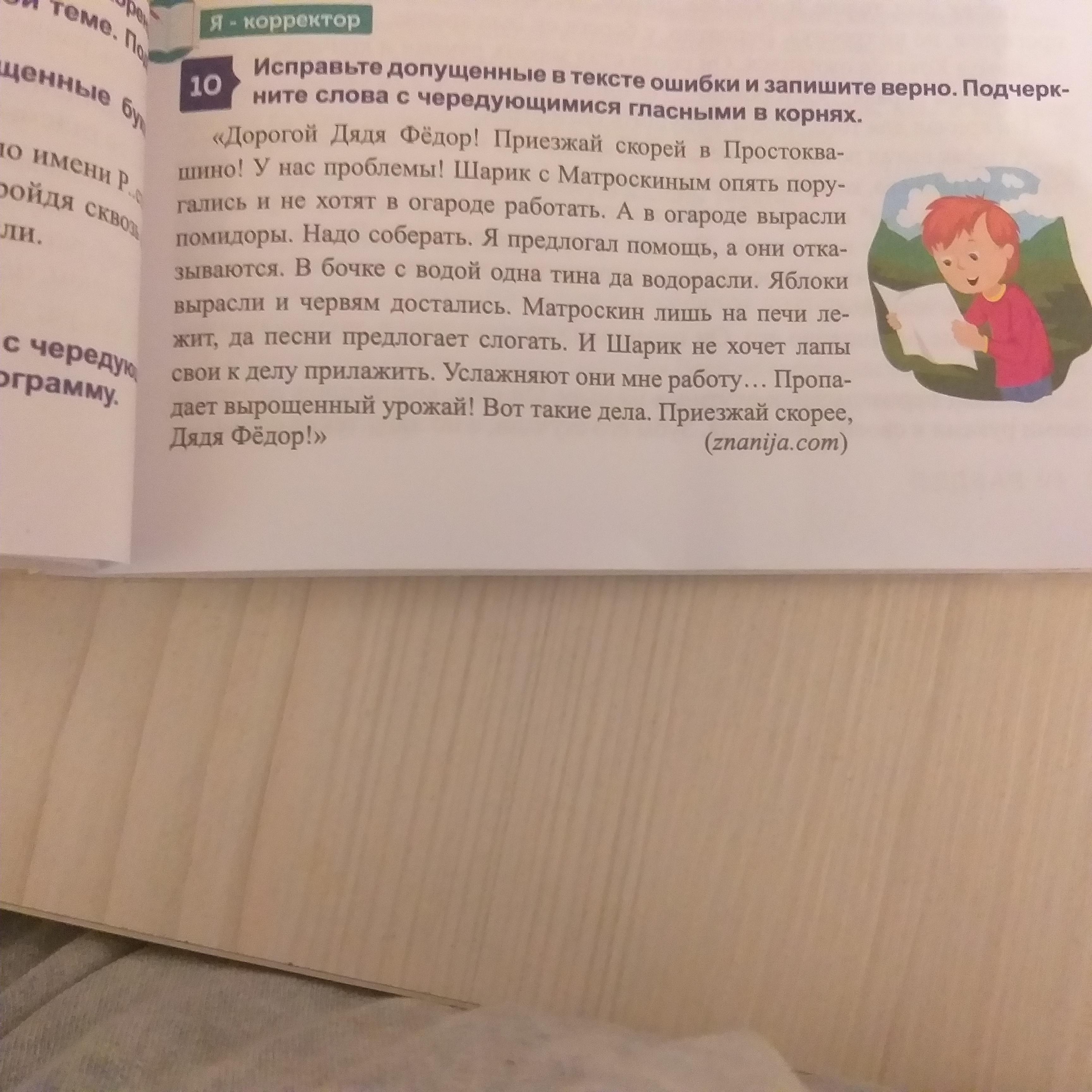 Дорогой Дядя Фёдор! Приезжай скорей в Простоквашино! У нас проблемы! Шарик с Матроскиным опять поругались и не хотят в огороде работать. А в огороде вырОсли помидоры. Надо собирать. Дорожки позарОстали бурьяном. Я предлАгал помощь, а они отказываются. В бочке с водой одна тина да водорОсли. Яблоки выроОли и червям достались. Матроскин лишь на печи лежит, да песни предлАгает слагать. И Шарик не хочет лапы свои к делу прилОжить. УслОжняют они мне работу…Пропадает выращенный урожай! Вот такие дела. Приезжай скорее, Дядя Фёдор!