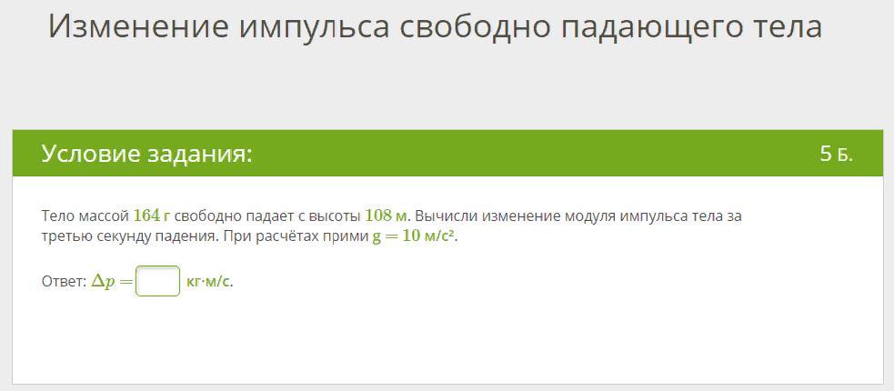Теперь находим импульс p=m*v = 0.491 кг * 20 м/с = 9,82 кг·м/с - это и есть изменение так, как начальной скорости не было, соответственно и нет импульса.