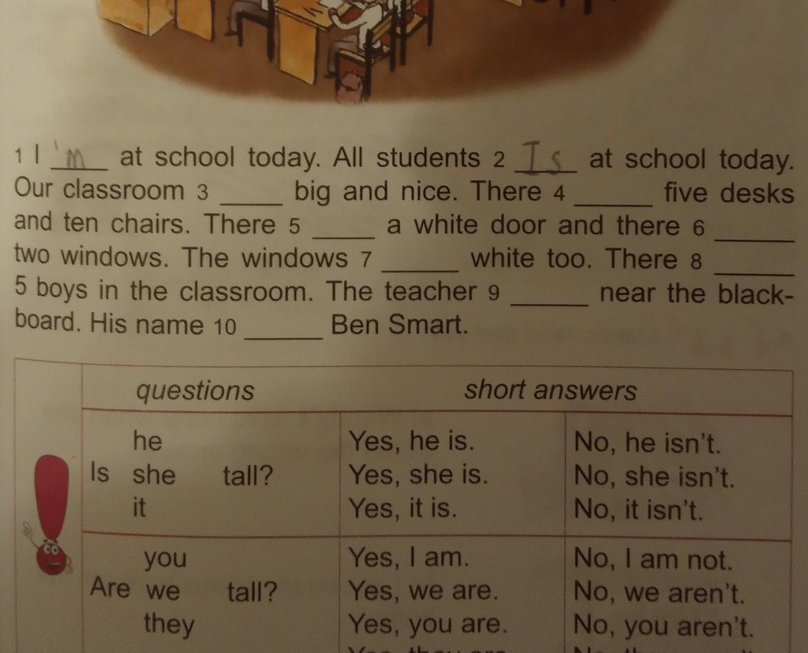 I am at school today. All students are at school today. Our classroom is big and nice. There are five desks and ten chairs. There is a white door and there are two windows. The windows are white too. There are 5 boys in the classroom. The teacher is near the blackboard. His name is Ben Smart.