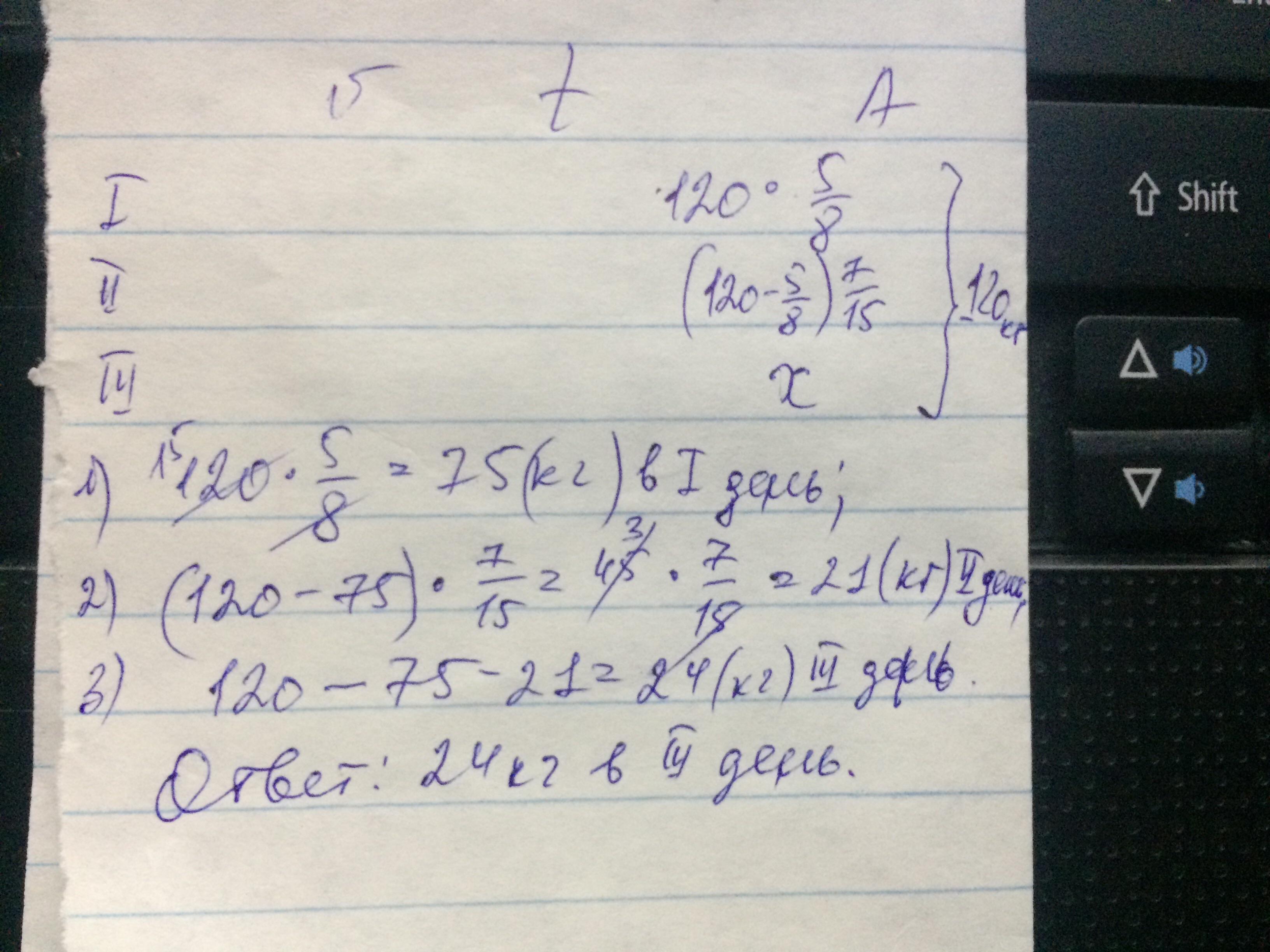 за три дня было собрано 120 кг моркови за первый день было собрано 5/8 моркови за второй 7/15 остатка сколько собрали моркови в третий день