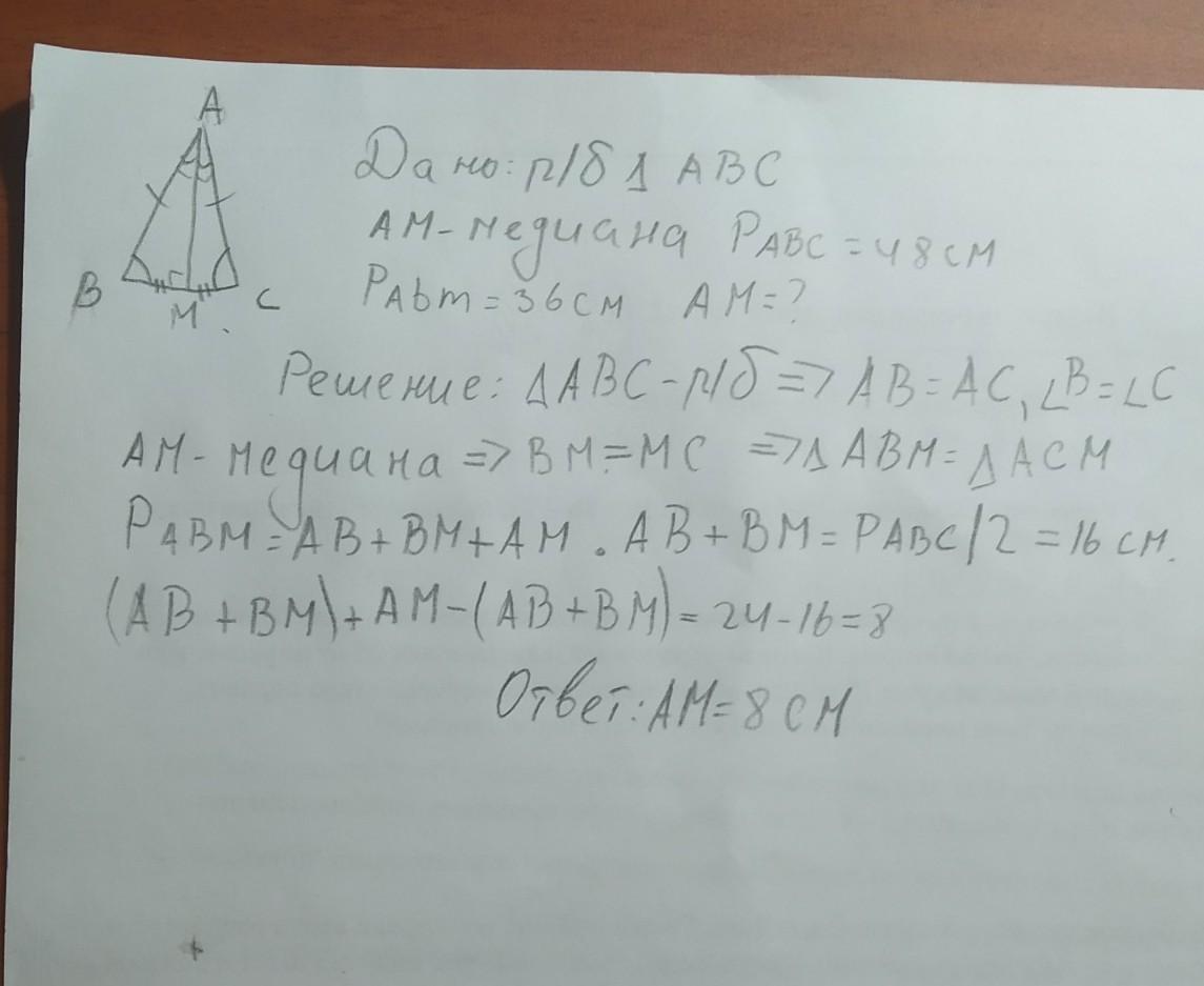 в равнобедренном треугольнике abc с основанием bc проведена медиана ам найдите медиану ам если периметр треугольника abc равен 48 см,а периметр треугольника abm равен 36 см