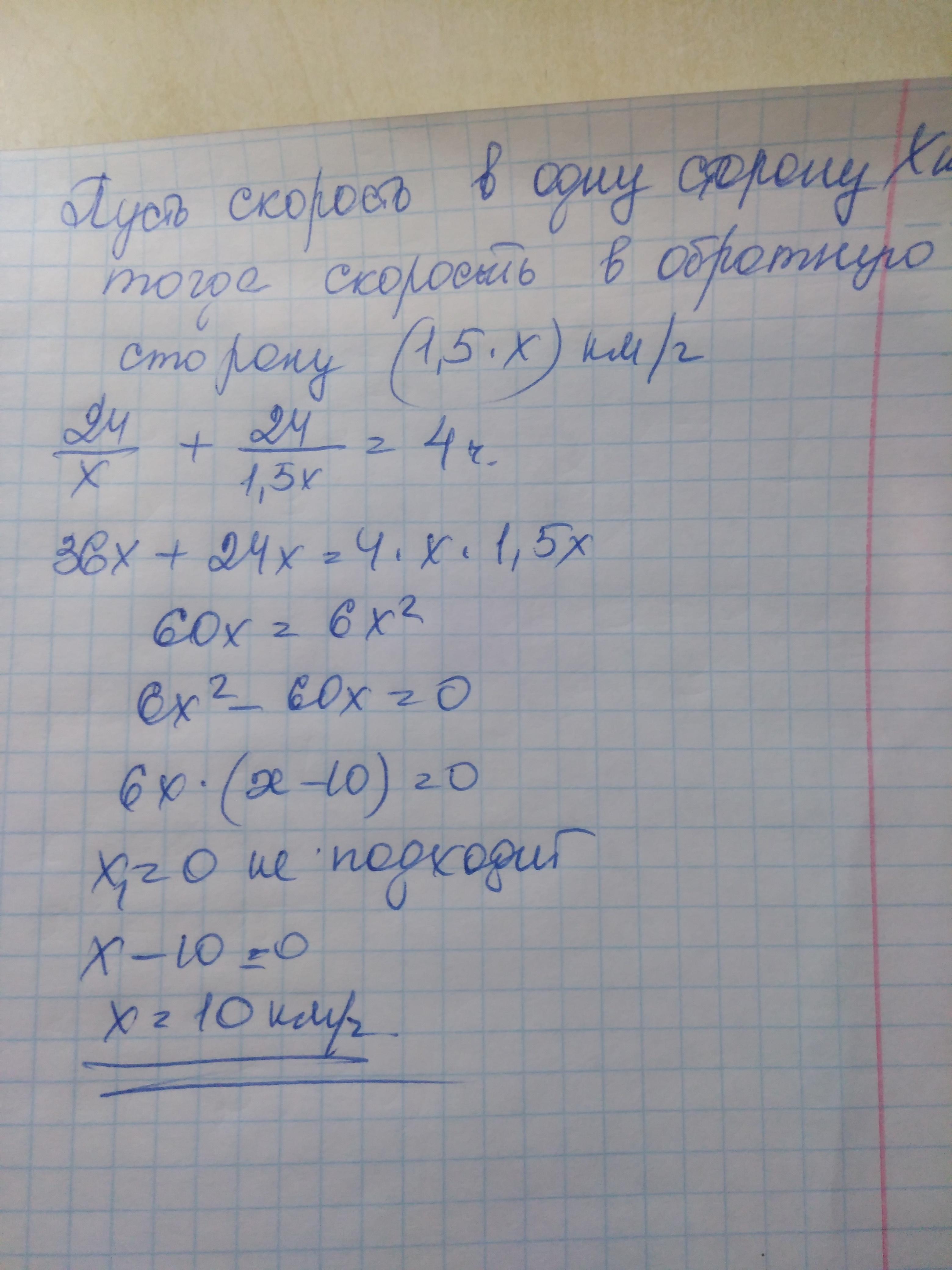 24 / скорость + 24 / (1,5* скорость) = (учли, что второй такой же путь он ехал в 1,5 раз быстрее)