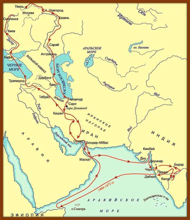 На карте изображен маршрут путешествия Афанасия Никитина.