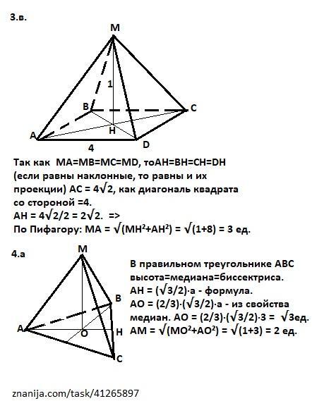 3в. Так как МА=МВ=МС=МD, тоAH=BH=CH=DH (если равны наклонные, то равны и их проекции) АС = 4√2, как диагональ квадрата со стороной =4.