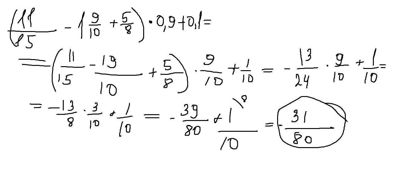 23 БАЛЛА! Помогите с примером (11/15 - 1 9/10 + 5/8) * 0,9 + 0,1