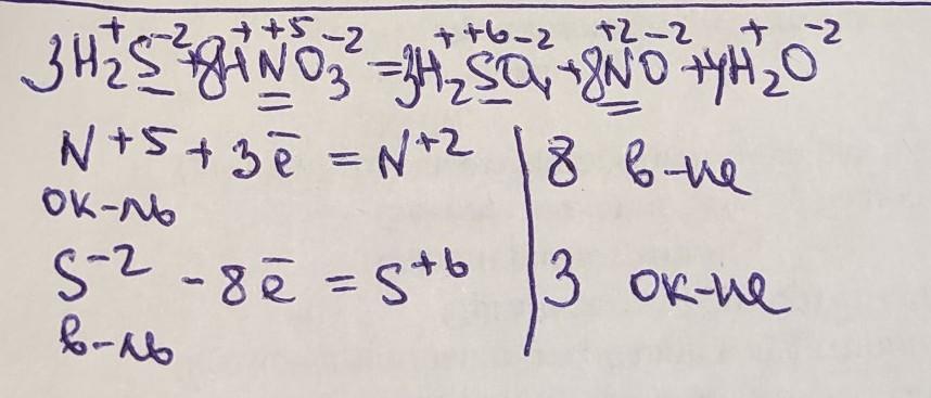 H2S+ HNO3= H2SO4+ NO(стрелка вверх)+ H2O