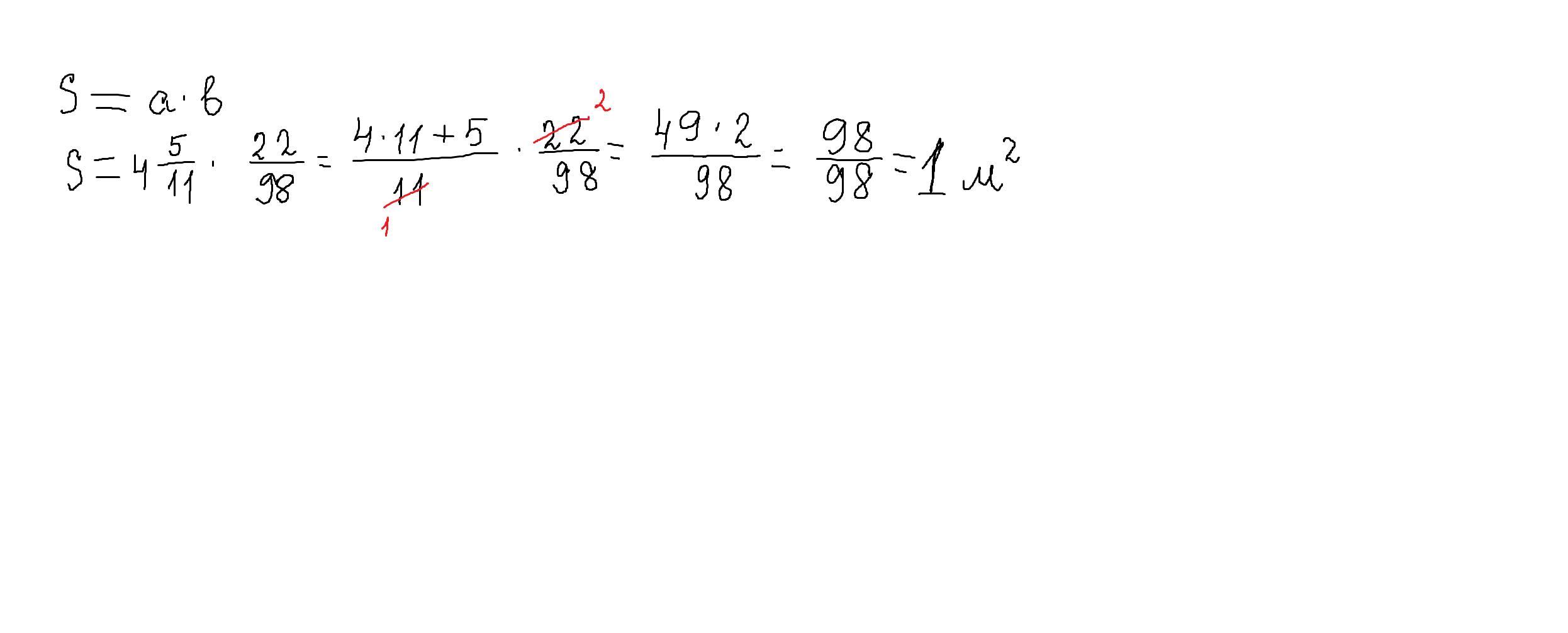 S=a*b= 4 5/11*22/98= 49/11*22/98 = 1 м2