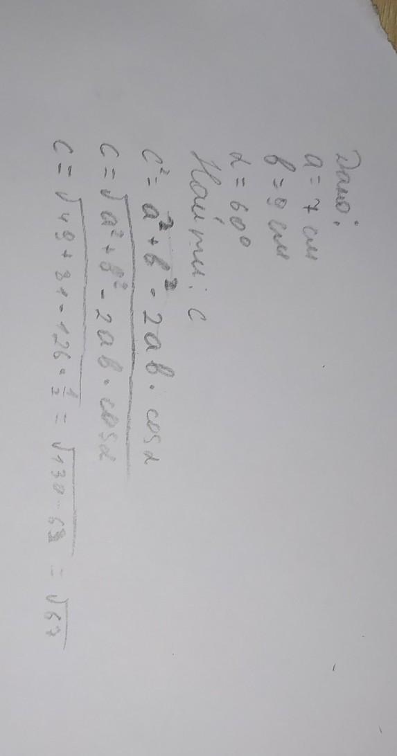Вычисли третью сторону треугольника, если две его стороны соответственно равны 7 см и 9 см, а угол между ними равен 60°.