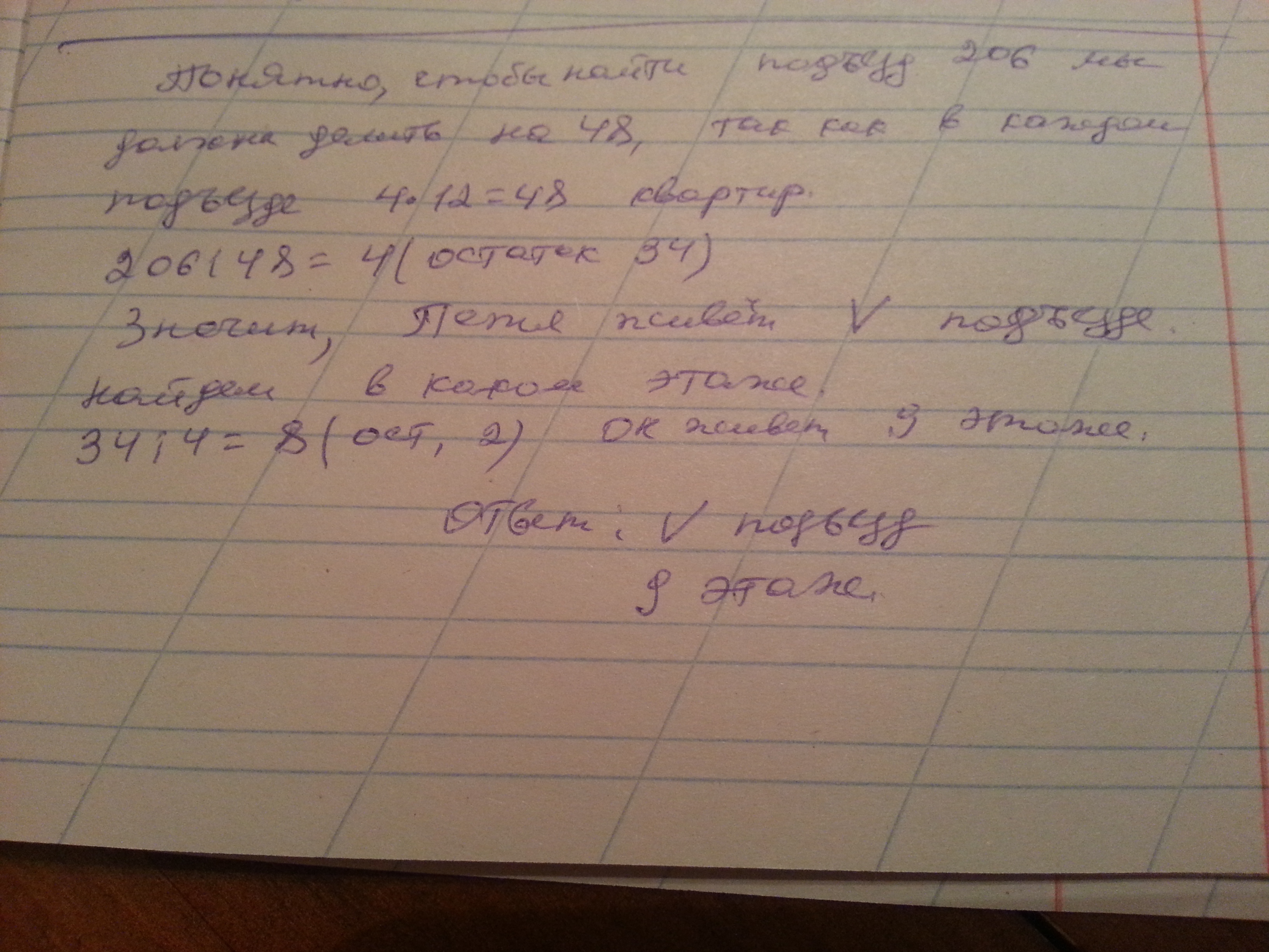 Петя живет в двенадцатиэтажном дома в квартире номер 206.В доме несколько подъездов,в каждом подъезде на каждом этаже 4 квартиры.В каком подъезде и на каком этаже живет Петя?