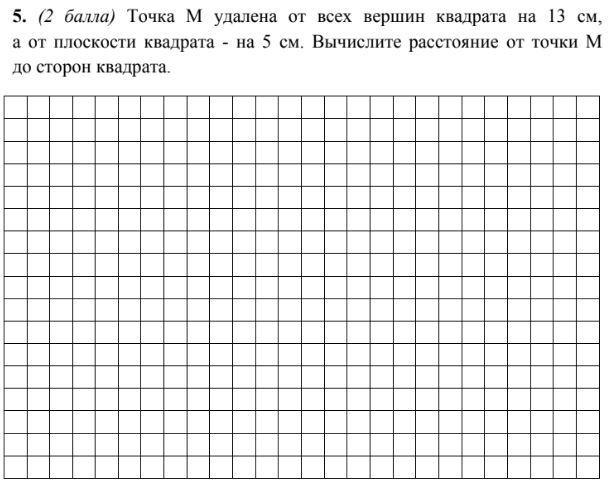 Пусть O - центр квадрата, в него проецируется точка М. Тогда по теореме Пифагора расстояние от O до вершин квадрата равно 12. А расстояние от точки О до сторон квадрата в раз меньше. Снова по Пифагору расстояние от М до сторон квадрата равно