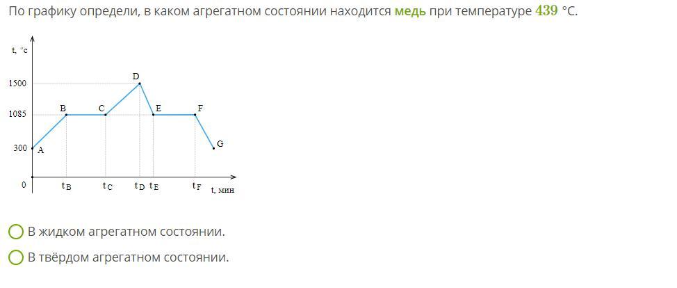 По графику определи, в каком агрегатном состоянии находится медь при температуре 439 °С.
