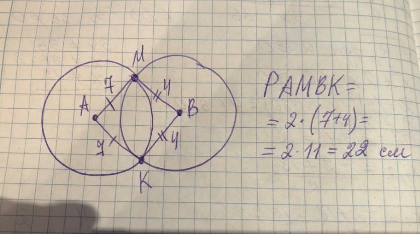 Две окружности с центрами в точках А и В пересекаются в точках М и К. Найдите периметр четырёхугольника АМВК, если радиусы окружностей 7см и 4см.